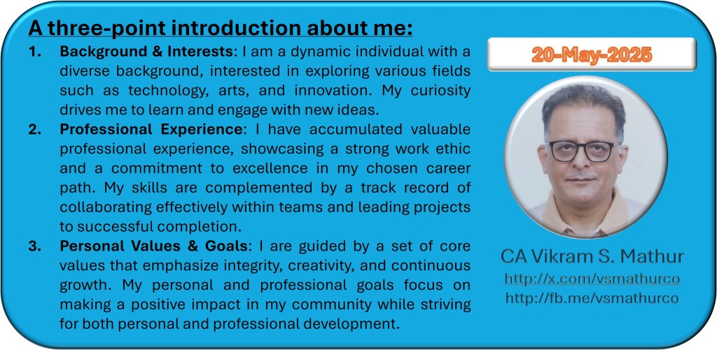 In summary, vsmathur@vsmathurco.in represents a unique blend of accounting expertise and digital innovation. Owned by Vikram Shankar Mathur, the digital showroom at www.cavsm.link is a testament to his commitment to leveraging technology for business growth, client satisfaction, and operational efficiency. While the exact features and offerings of the digital showroom are not detailed in current sources, its existence underscores Mathur’s adaptability and readiness to embrace new digital frontiers in professional services214.