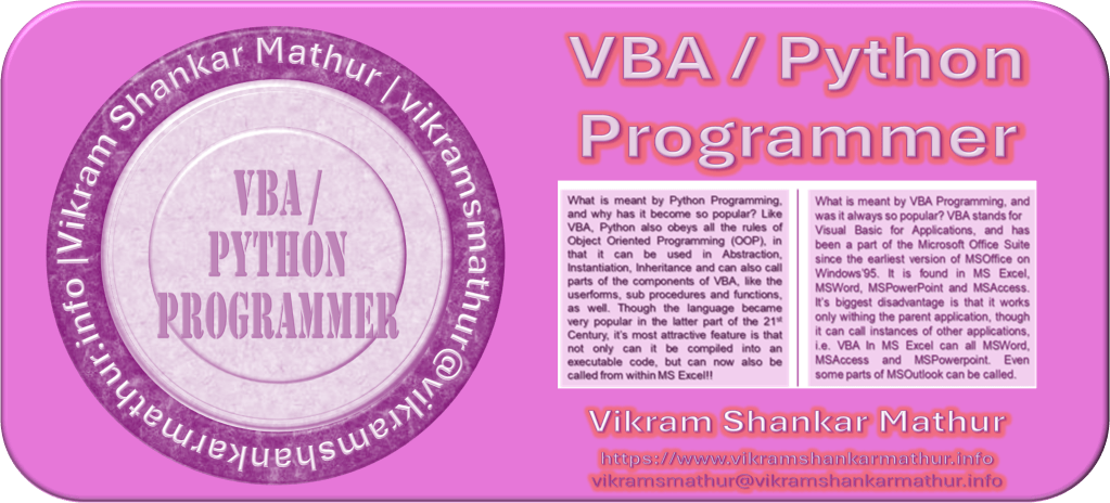 Vikram Shankar Mathur, operating under the professional identity vsmathur@vsmathurco.in, is a Chartered Accountant by profession and a developer by choice, based in Ahmedabad, Gujarat, India. His practice, M/s Vikram S. Mathur & Co., Chartered Accountants, has been active since 1989, specializing in accounting and audit services. Over the years, Mathur has expanded his expertise to include advanced programming and digital solutions, notably through Visual Basic for Applications (VBA) since 1995, and more recently, Python programming since January 2025123. He is also familiar with Node.JS and JavaScript, positioning himself at the intersection of finance and technology.